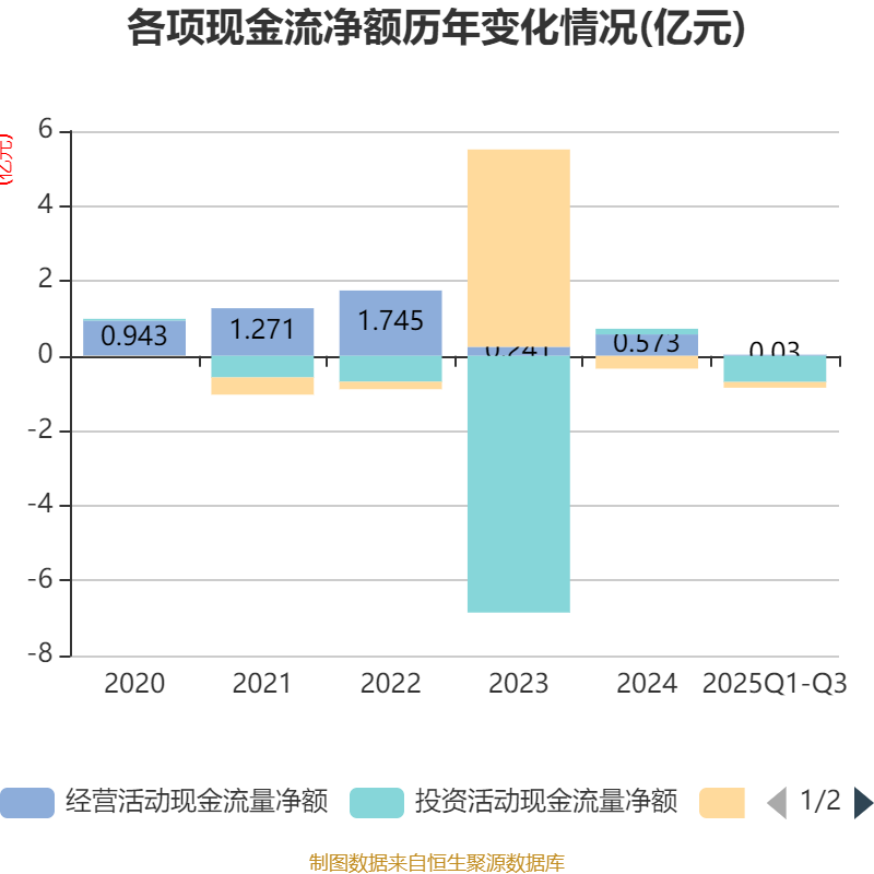 2025年前三季度,公司经营活动现金流净额为304.77万元,同比下降89.4%;筹资活动现金流净额-1532.88万元,同比增加587.22万元;投资活动现金流净额-6977.24万元,上年同期为-18.77万元。