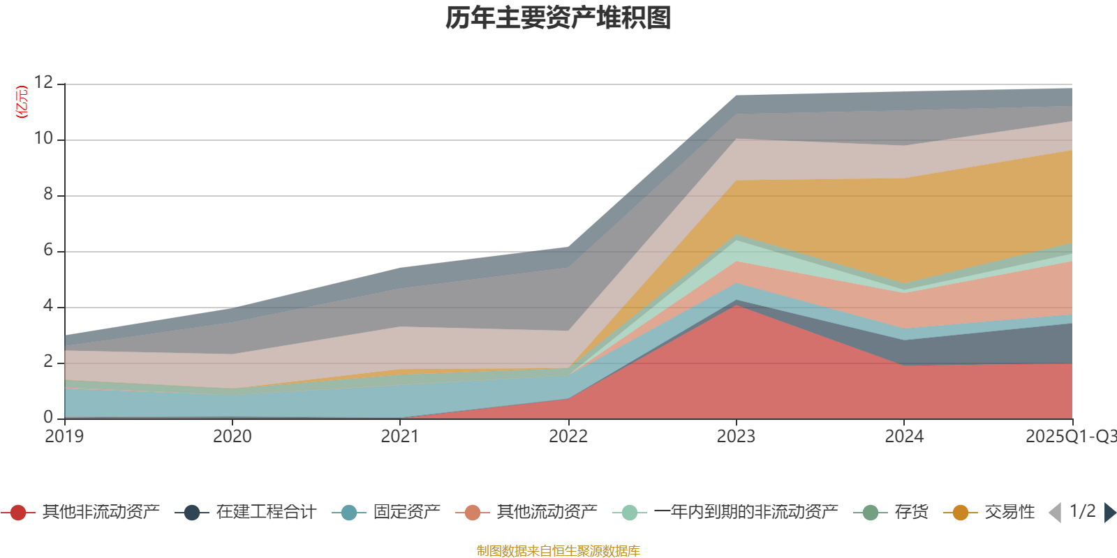 资产重大变化方面,截至2025年三季度末,公司货币资金较上年末减少57.23%,占公司总资产比重下降6.2个百分点;其他流动资产较上年末增加50.09%,占公司总资产比重上升5.26个百分点;在建工程合计较上年末增加55.8%,占公司总资产比重上升4.26个百分点;交易性金融资产合计较上年末减少11.83%,占公司总资产比重下降4.1个百分点。