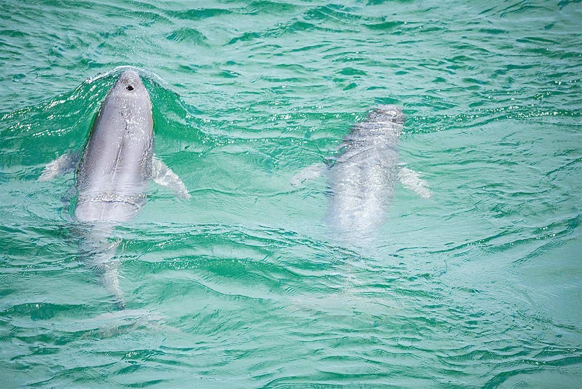 长江江豚在碧绿的江水中逐浪嬉戏,翩翩起舞,呈现出一副自然和谐的生态画面。(视界网 吴承忠 摄)