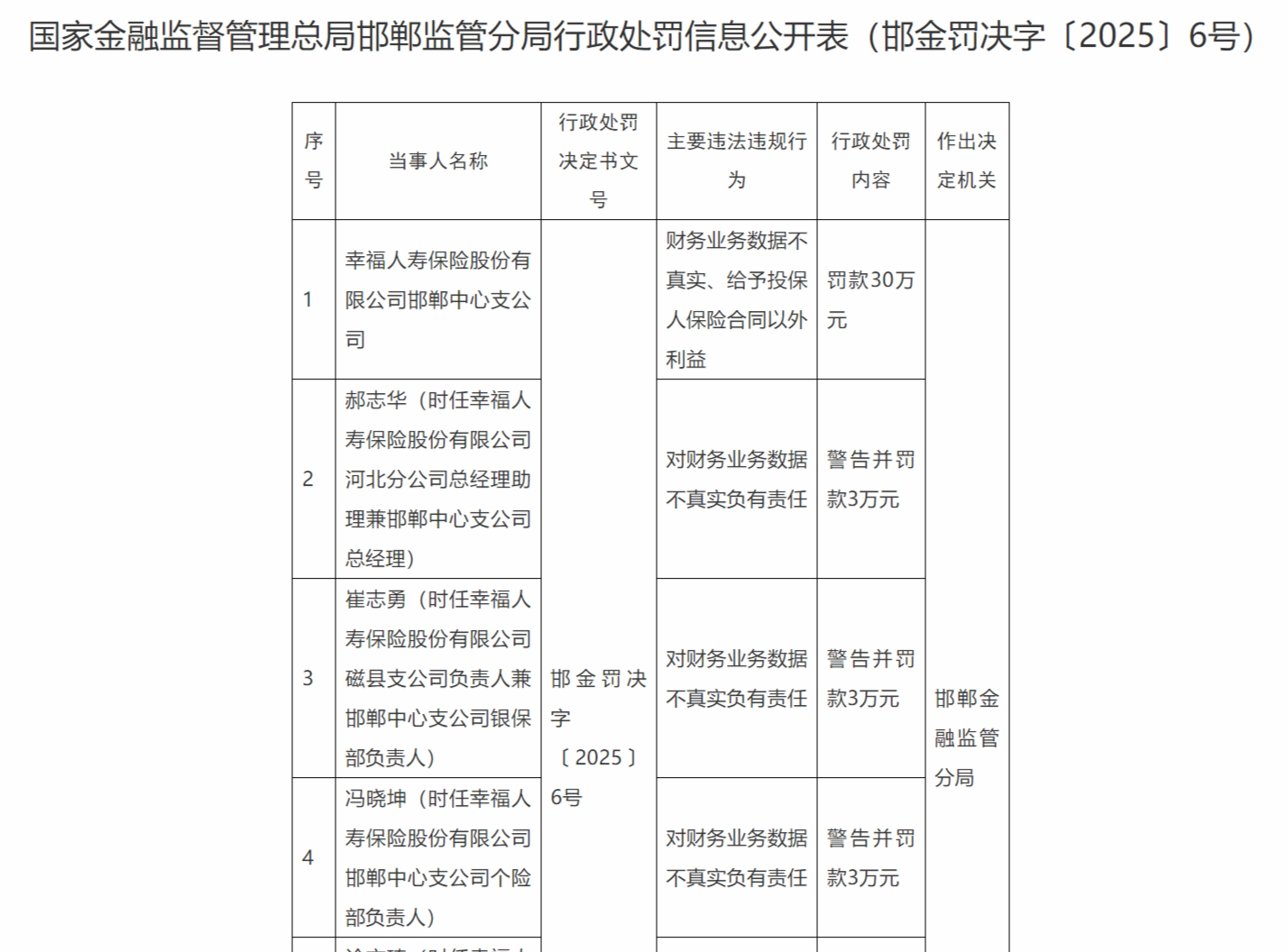 网上股票配资平台 财务业务数据不真实、给予投保人保险合同以外利益,幸福人寿邯郸中心支公司被罚30万 网上股票配资平台 来源:景逸策略 网站:华林优配 日期:2025-11-05 11:56:33 查看:65