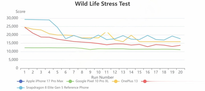 我们发现一个很不好的趋势:多款搭载骁龙8 Elite芯片的机型,都把峰值性能看得比持续输出性能更重要。这就导致一个问题:这类手机在单次跑分中表现亮眼,可一旦进入长时间的3DMark Wild Life高负载压力测试,就会因为机身过热,根本没法维持高性能输出。这个缺陷在运行大型手游和主机模拟器时,影响尤为明显。